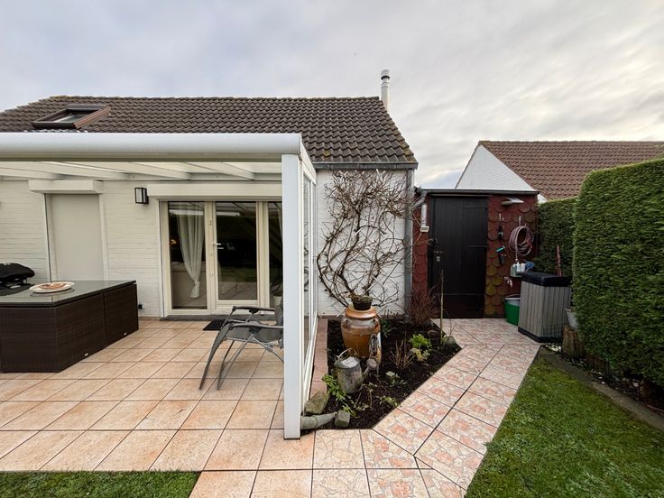 Met zorg onderhouden en reeds gedeeltelijk gerenoveerd, biedt deze woning een warm en uitnodigend karakter. De lichte en gezellige woonkamer loopt naadloos over in de halfopen keuken en geeft rechtstreeks toegang tot het overdekte terras en de zonnige tuin, perfect georiënteerd op het zuidwesten. Verder op het gelijkvloers 2 slaapkamers waarvan 1 met afzonderlijk toilet en een badkamer met douche en 2de toilet. Een volledig afgewerkte mezzanine voegt extra ruimte toe en kan ingericht worden als derde slaapkamer. Achteraan bevindt zich een praktische buitenberging met aansluiting voor was- en droogmachine. Tot slot maakt een privatieve parkeerplaats het geheel compleet. Onderheving aan de Vlaamse renovatieplicht.