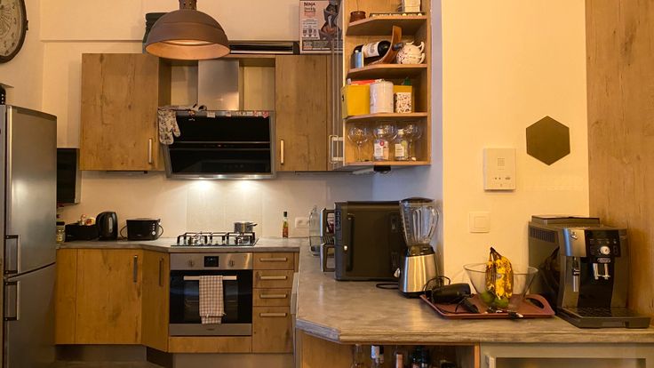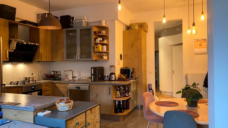 - Une grande cuisine ultra équipée ouverte sur un espace salle à manger.