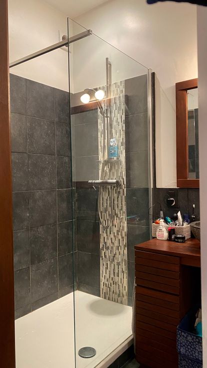 - Un hall d'entrée desservant une salle de bain avec douche et baignoire et une toilette séparée.