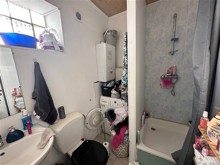 doucheruimte met WC (douche, WC, 1 wastafel + spiegel en ruimte voor wasmachine)
