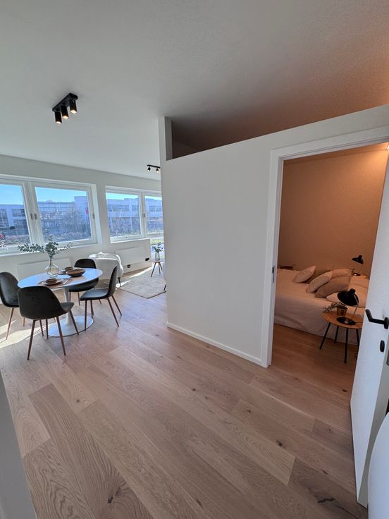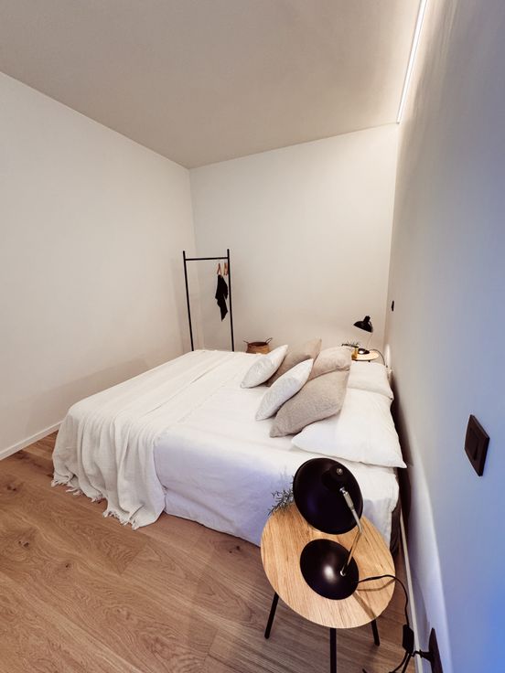 De inkomhal geeft uit op de slaapkamer, die ruimte biedt voor een dubbel bed en grote kleerkast en de lichtrijke leefruimte met zithoek en eetplaats.