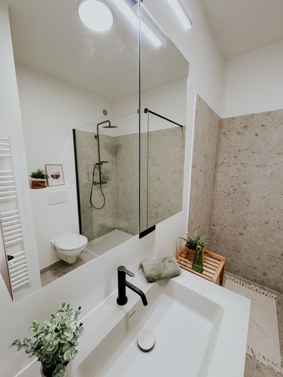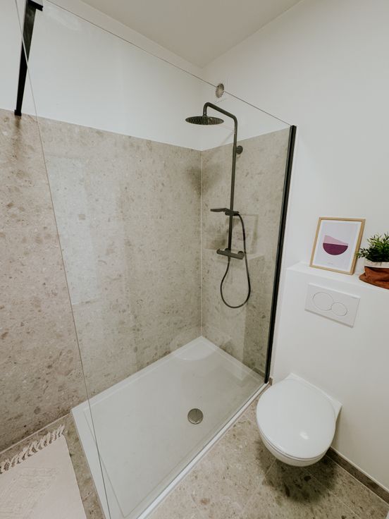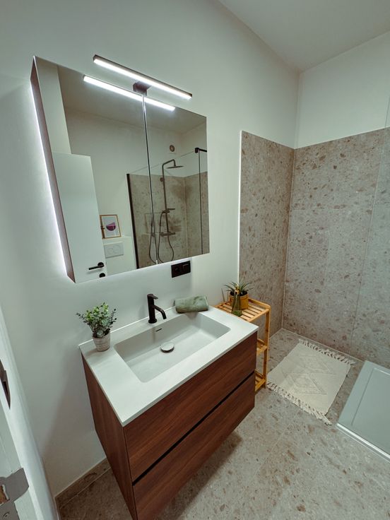 Recht voor je situeert zich de stijlvolle badkamer met ruime inloopdouche, hangtoilet en luxueus badkamermeubel met verlichte spiegelkast.