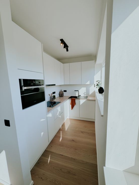 De nieuwe en volledig uitgeruste ruime witte keuken met greeploze kasten en kwalitatieve Whirlpool toestellen maakt het plaatje compleet.