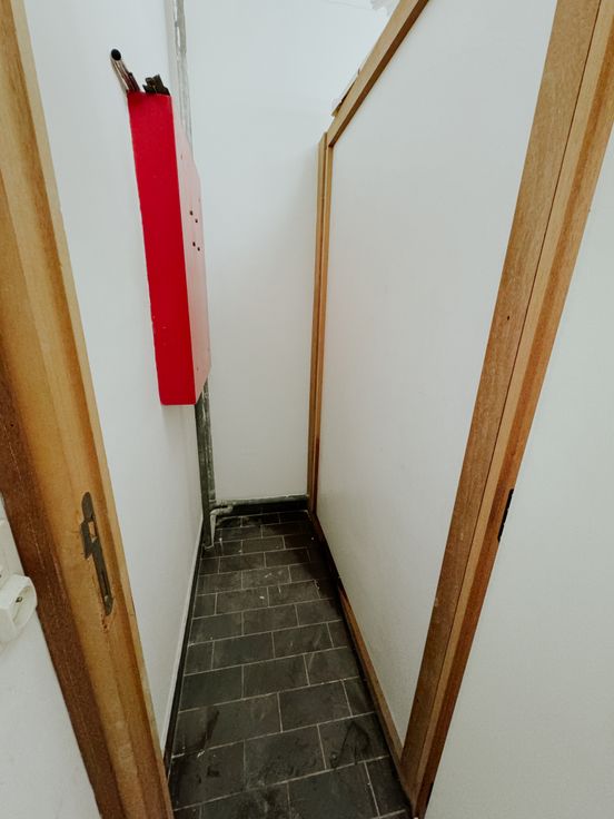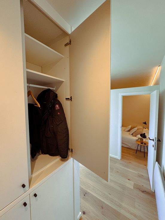 Via de nieuwe akoestische inkomdeur kom je in de hall met ingemaakte vestiairekast.
