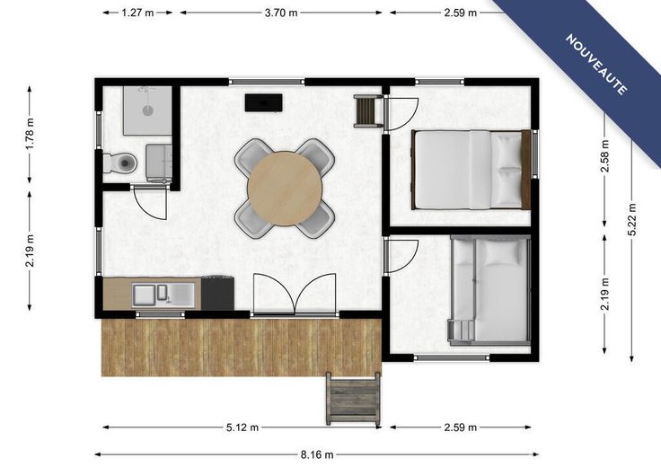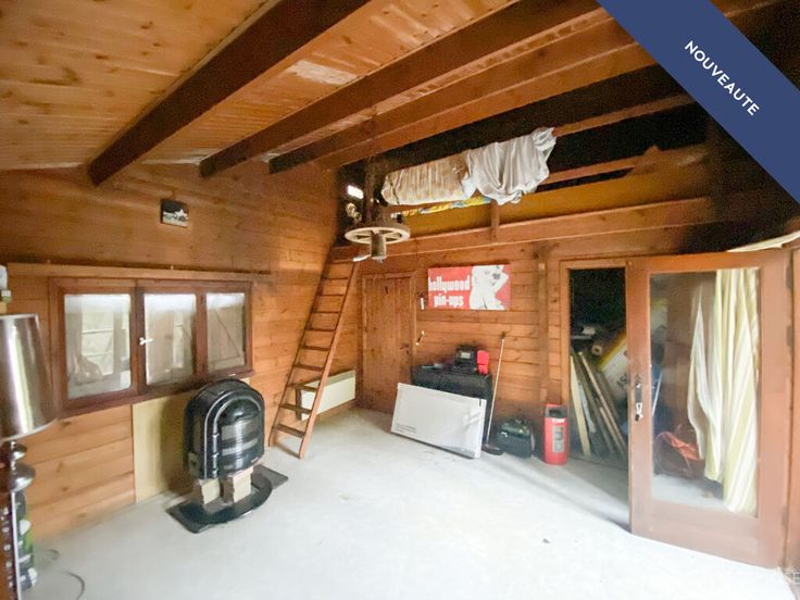 Le chalet est composé d'un pièce de vie avec cuisine, une pièce d'eau avec évier, wc et douche, deux chambres, un espace mezzanine pour couchage supplémentaire, un espace terrasse et un sous-sol offrant un beau volume de rangement (outils, vélos, ...)