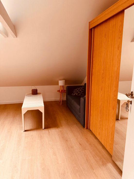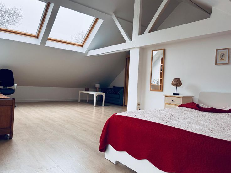 La chambre comprend 1 lit double 1,60x200cm, 2 tables de nuit, 1 garde robe, 1 fauteuil 2 personnes, 1 table basse, 1 bureau, 1 étagère. La fenêtre donne sur le jardin situé au sud et il y a 2 velux à l’ouest.
