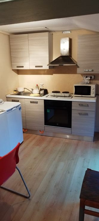 La kitchenette comprend 2 pièces (1x5m² + 1x7m²) dont les fenêtres donnent sur le jardin. Au même étage se situe 1 salle de bain de bain avec WC, baignoire/douche et lavabo.
