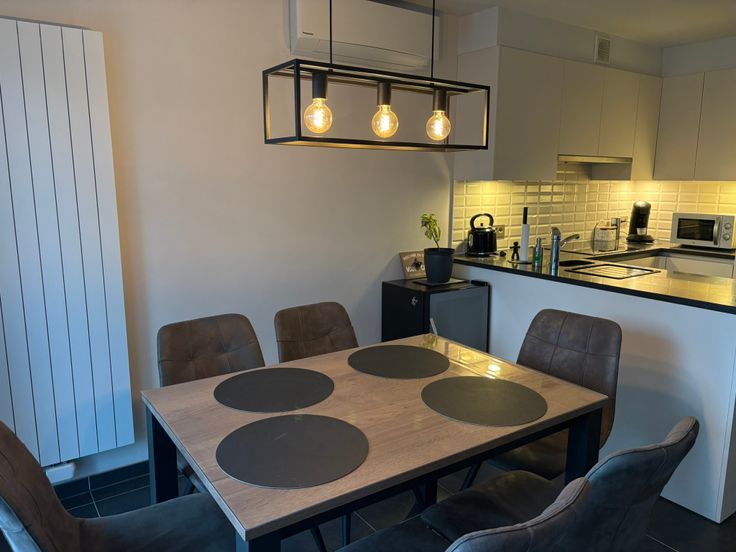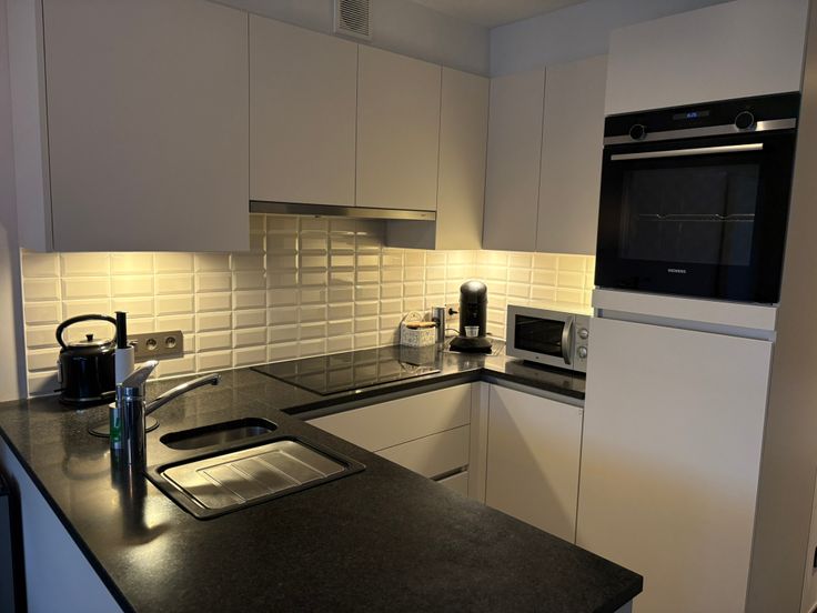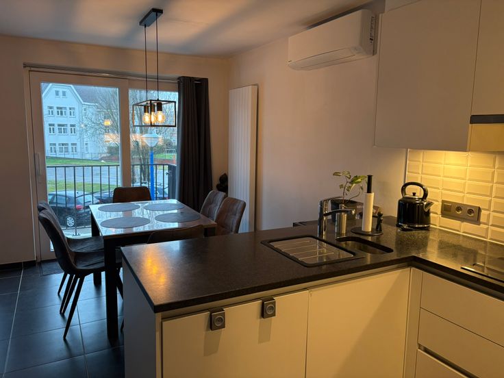 * Open keuken met granieten werkblad en moderne toestellen