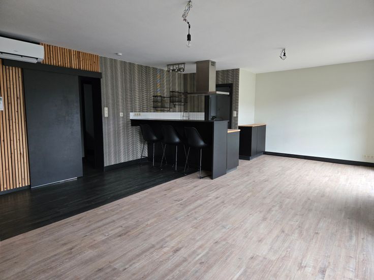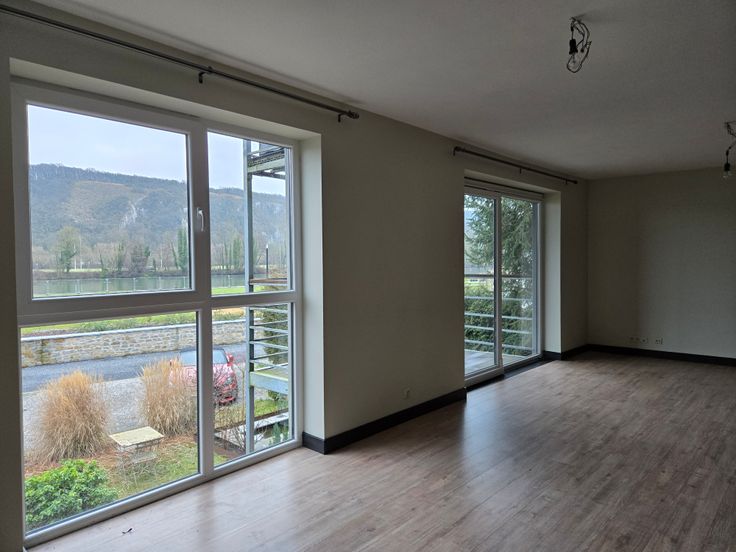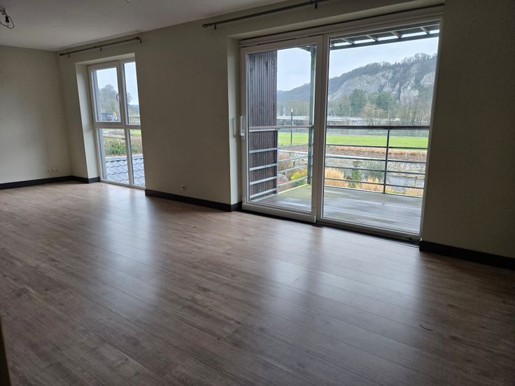 Appartement 1er étage (PEB A+): comprenant living avec cuisine américaine (37 m²) et terrasse (9 m²) l'ensemble vue Meuse. Une buanderie, un hall de nuit, un wc séparé, deux chambres.