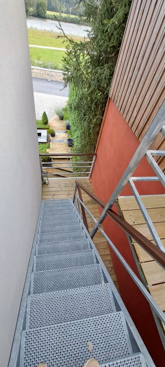 Duplex 2ème étage (PEB A): comprenant living avec cuisine américaine (37 m²) et terrasse (9 m²) l'ensemble vue Meuse. Une buanderie, un hall de nuit, un wc séparé, deux chambres et une mezzanine avec chambre de (32 m²).