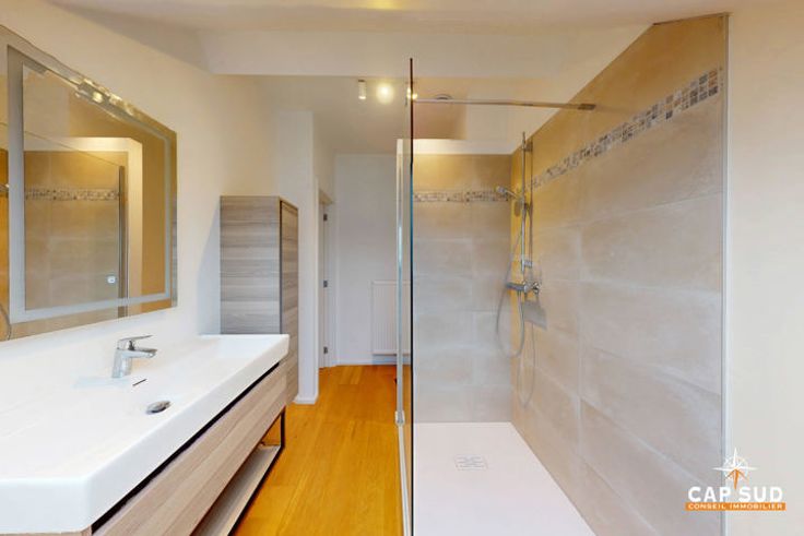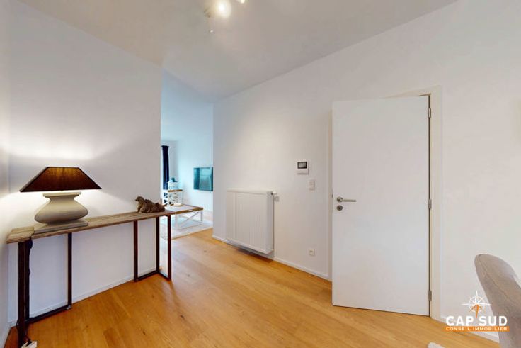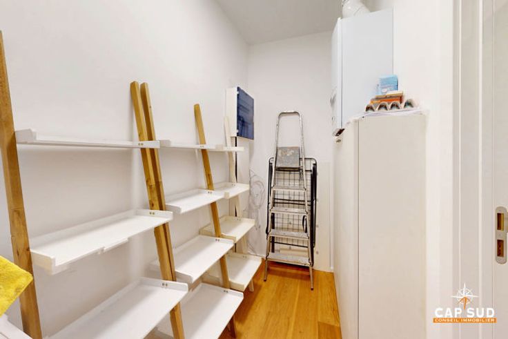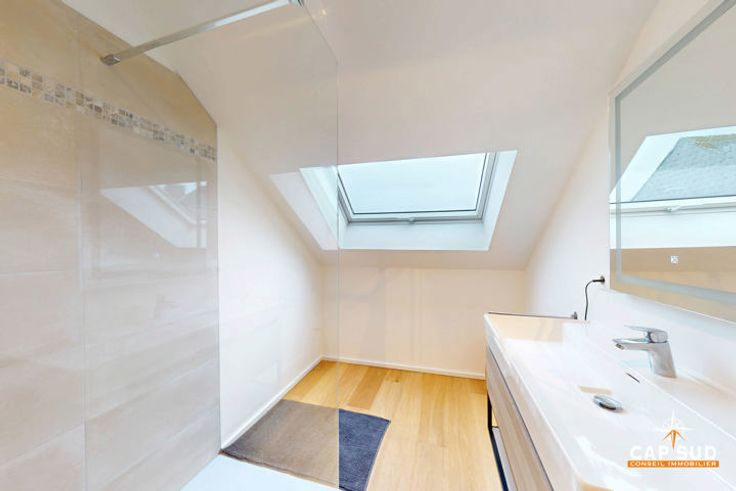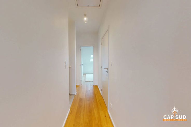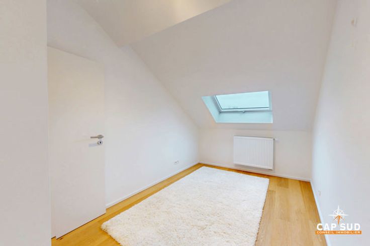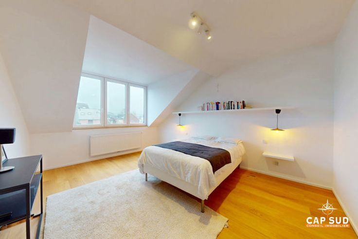 À l’étage supérieur, le duplex dispose d’une grande chambre spacieuse et lumineuse, ainsi que d’une seconde chambre légèrement plus petite. Une salle de douche à l’italienne et une buanderie complètent ce niveau.