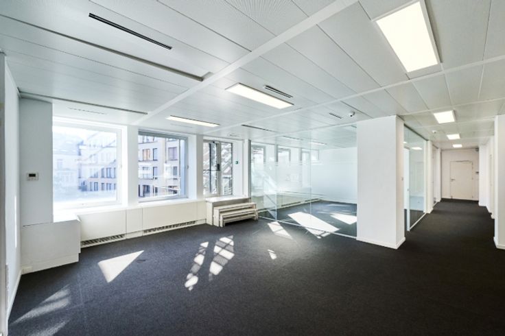Aangename kantoren te huur in de Louiza wijk.  Oppervlakte: 327 m². Parking ratio: 1/50 m² (1.600 €/plaats/jaar). Archieven: 284 m² (85 €/m²/jaar).