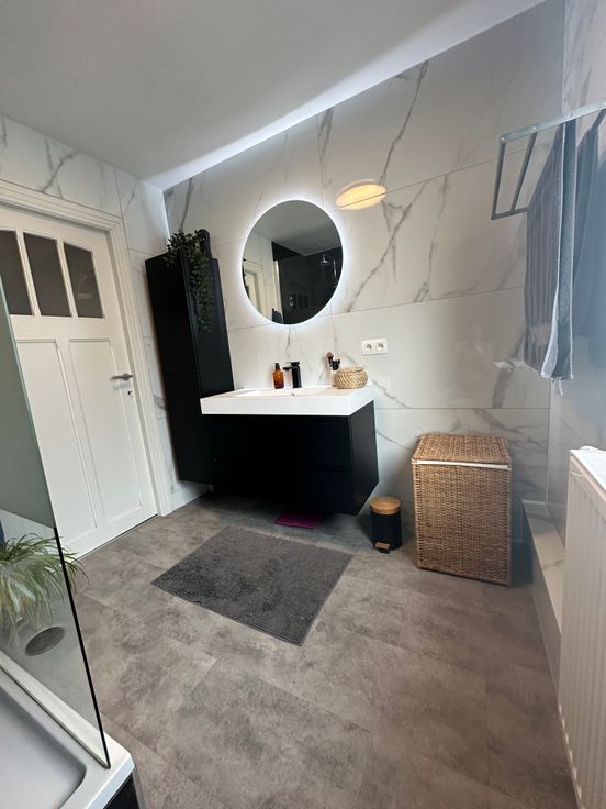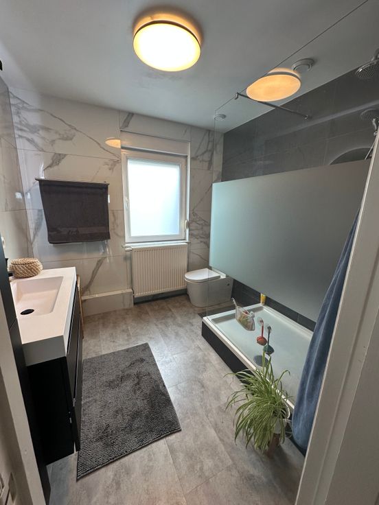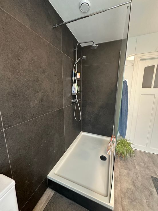 - Salle de bain fraîchement rénovée avec douche ouverte