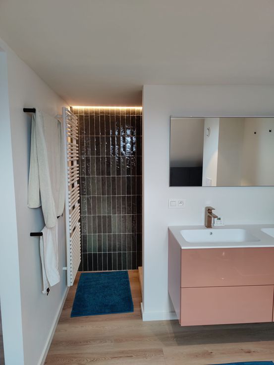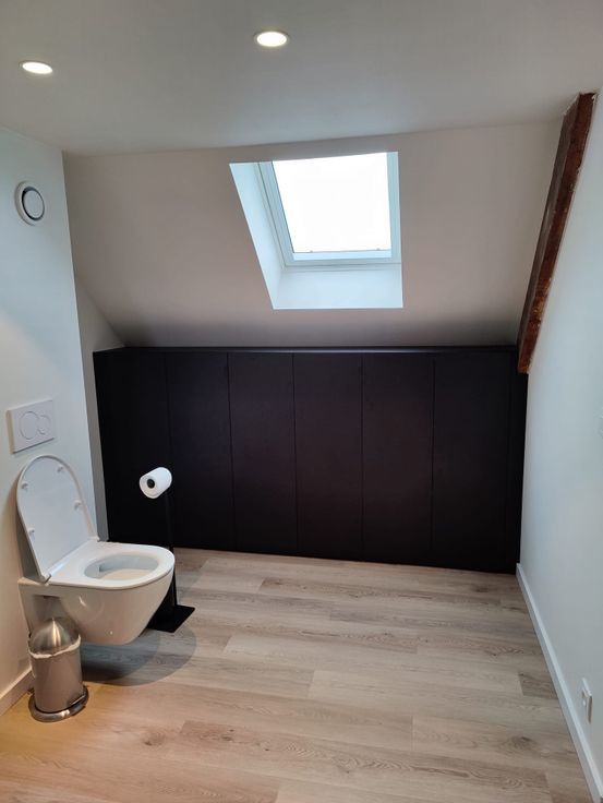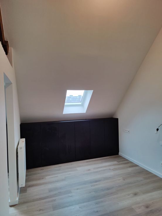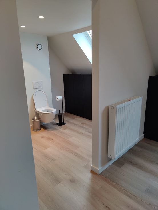Tweede verdieping: grote slaapkamer met eigen badkamer (inloopdouche met dubbel lavabomeubel en toilet). Ingemaakte kasten in de dakhelling. Mezzanine te gebruiken als opbergruimte of gezellig hoekje.
