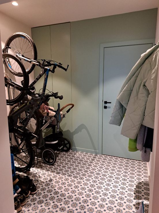 Gelijkvloers: inkomhal met fietsenberging en gastentoilet. Kelder onder de inkomhal. CV-ketel en technische ruimte in ingemaakte kast. Living, keuken (oven, combi oven, inductievuur en frigo) met bergruimte voor wasmachine, droogkast en extra frigo. Unit ventilatiesysteem D eveneens in de berging. Omvormer en thuisbatterij in de berging. tstraat tussen living en keuken (met screen). Groot schuifraam richting de tuin met vliegenraam (met screen). Pas aangelegde tuin met zonneterras.