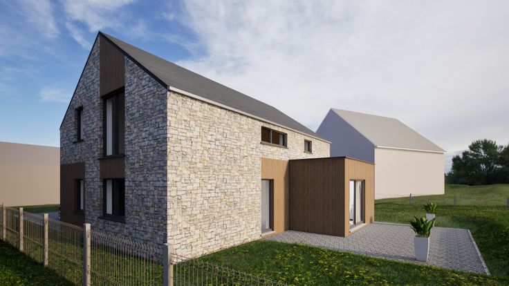 Charmant huis met 4 gevels, houten frame en bekleding van hout en steen, te koop. Beschikbaar vanaf april 2025