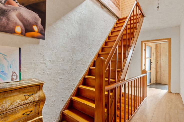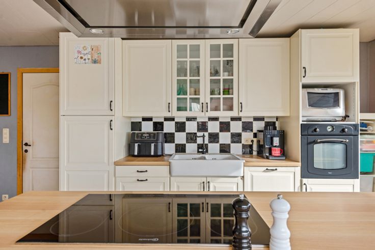 Gelijkvloers: inkomhal, ruime leefruimte met kacheltje, volledig geïnstalleerde keuken met zicht op de tuin, apart toilet, wasruimte en technische ruimte.