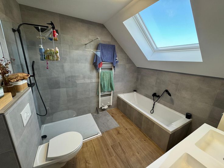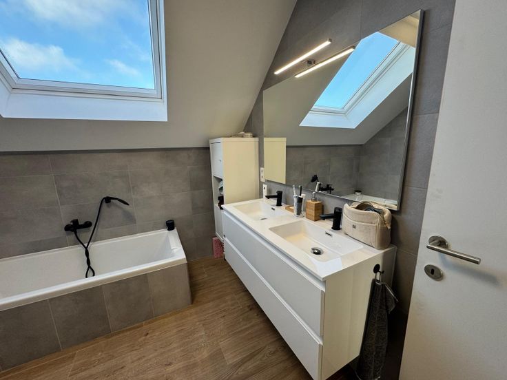 - Salle de bain avec baignoire, douche, double vasque et WC.