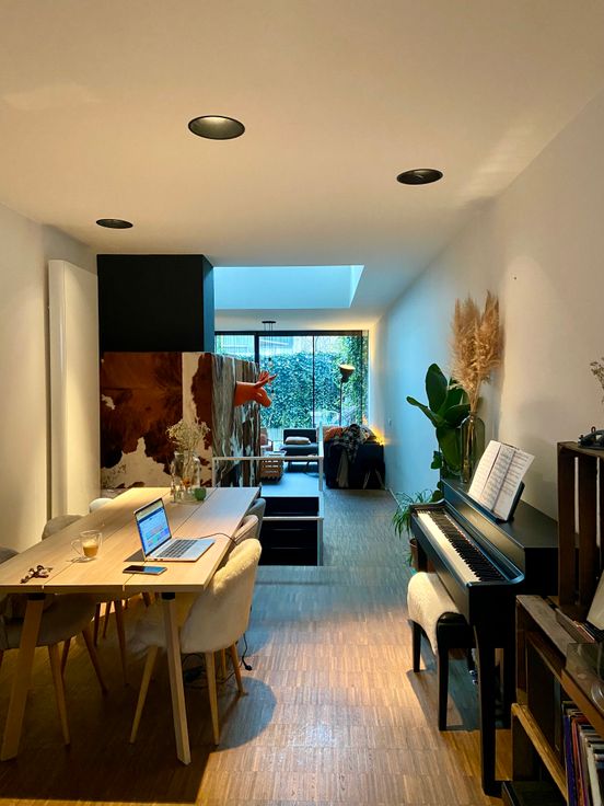 Volledig ingerichte keuken, high-end afgewerkt met materialen zoals eik en corian, ingebouwde vaatwasser en inductie kookplaat. Hoogkant parketvloer in de eetruimte, regendouche in de badkamer. Cosy slaaphoek met ingebouwde kastruimte op duplexniveau.