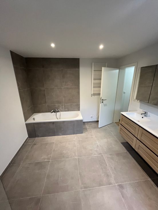 Le 1er étage compte une grande chambre de 17 m² et d’une magnifique pièce d’eau de 11 m² avec une baignoire, un WC et une douche.