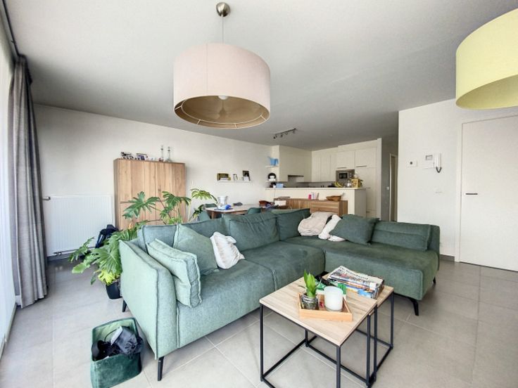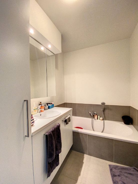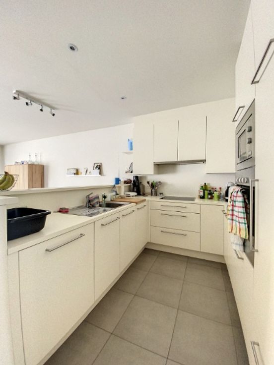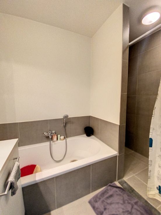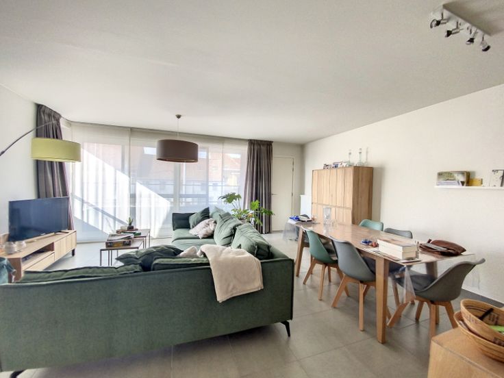 lichtrijke living 32 m², ingerichte open keuken met keramische kookplaat, oven, dampkap, vaatwas en frigo, koele berging, stook-/wasplaats, gastentoilet, badkamer met inloopdouche, ligbad & lavabomeubel, 2 slaapkamers (15+9 m²), terras vooraan en ruim zonneterras 24m² achteraan, gezamenlijke fietsenberging en private parking;