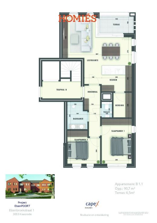 Lichtrijk appartement met overdekt terras, deel uitmakend van het exclusief nieuwbouwproject ElsenPOORT. De oppervlakte van het appartement omvat plusminus 91m² en de woonkamer heeft een oppervlakte van 37m², aansluitend een terras (6,5m²) dat een mooie extensie biedt op de woonvertrekken. De open leefkeuken is functioneel en geëquipeerd en heeft ook toegang tot het terras. De badkamer is compact en wordt voorzien van een inloopdouche/ligbad en wastafel, een apart toilet en berging. Het appartement omvat 2 slaapkamers van 12,56m2 en 10m2. Bijkomend pluspunt is de ruime zolderruimte voor extra opbergruimte. U navigeert ook makkelijk naar de ondergrondse garage. Het appartement beschikt over een ondergrondse privatieve berging en staanplaats (vereist bij aan te kopen) en toegang tot de gemeenschappelijke fietsenstalling Wij nodigen u graag uit voor een kennismakingsgesprek, met toelichting van het project en volledige kostenraming. Aankoop deels 6% btw mogelijk. Ideaal als investeringsopportuniteit of voor eigen bewoning. Bekijk de details in de brochure bij documenten op onze website, www.homies.be.  Plan uw werfbezoek of vraag meer informatie aan via: Info@homies.be of 016 22 82 22. Oplevering voorzien eind 2025 Renovatieplicht: onbekend