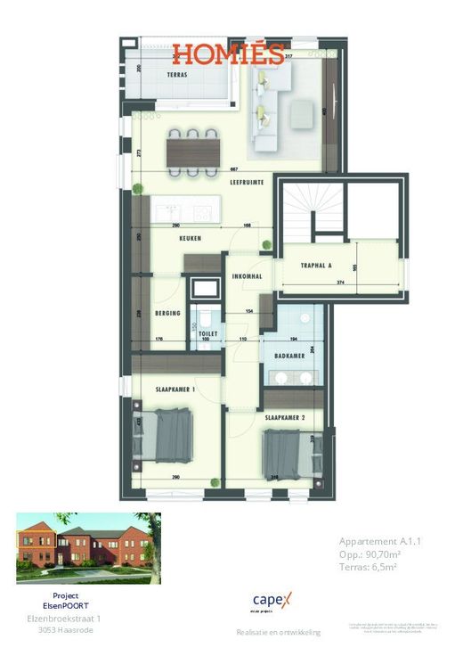 Lichtrijk appartement met overdekt terras, deel uitmakend van het exclusief nieuwbouwproject ElsenPOORT. De oppervlakte van het appartement omvat plusminus 91m² en de woonkamer heeft een oppervlakte van 37m², aansluitend een terras (6,5m²) dat een mooie extensie biedt op de woonvertrekken. De open leefkeuken is functioneel en geëquipeerd en heeft ook toegang tot het terras. De badkamer is compact en wordt voorzien van een inloopdouche/ligbad en wastafel, een apart toilet en berging. Het appartement omvat 2 slaapkamers van 12,56m2 en 10m2. Bijkomend pluspunt is de ruime zolderruimte voor extra opbergruimte. U navigeert ook makkelijk naar de ondergrondse garage. Het appartement beschikt over een ondergrondse privatieve berging en staanplaats (vereist bij aan te kopen) en toegang tot de gemeenschappelijke fietsenstalling. Wij nodigen u graag uit voor een kennismakingsgesprek, met toelichting van het project en volledige kostenraming. Aankoop deels 6% btw mogelijk. Ideaal als investeringsopportuniteit of voor eigen bewoning. Bekijk de details in de brochure bij documenten op onze website, www.homies.be.  Plan uw werfbezoek of vraag meer informatie aan via: Info@homies.be of 016 22 82 22. Oplevering voorzien eind 2025 Renovatieplicht: onbekend