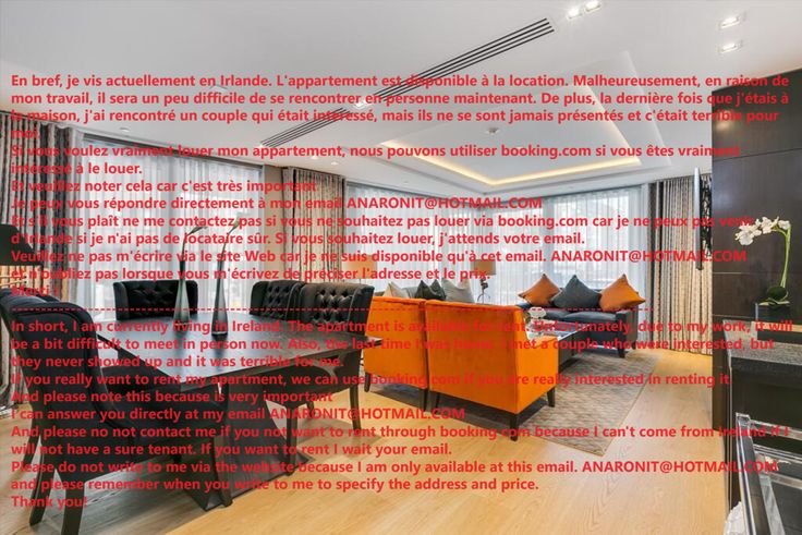 En bref, je vis actuellement en Irlande. L'appartement est disponible à la location. Malheureusement, en raison de mon travail, il sera un peu difficile de se rencontrer en personne maintenant. De plus, la dernière fois que j'étais à la maison, j'ai rencontré un couple qui était intéressé, mais ils ne se sont jamais présentés et c'était terrible pour moi. Si vous voulez vraiment louer mon appartement, nous pouvons utiliser booking.com si vous êtes vraiment intéressé à le louer. Et veuillez noter cela car c'est très important Je peux vous répondre directement à mon email qui est en photo. J'attends de me contacter.