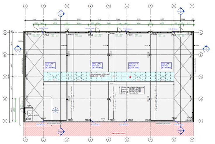- Elke unit beschikt over een toegangsdeur van 1,05m breedte en 4,50m hoogte