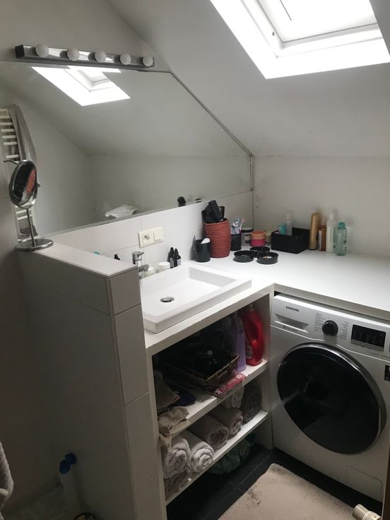 Une salle de douche comprenant un lave linge séchant.