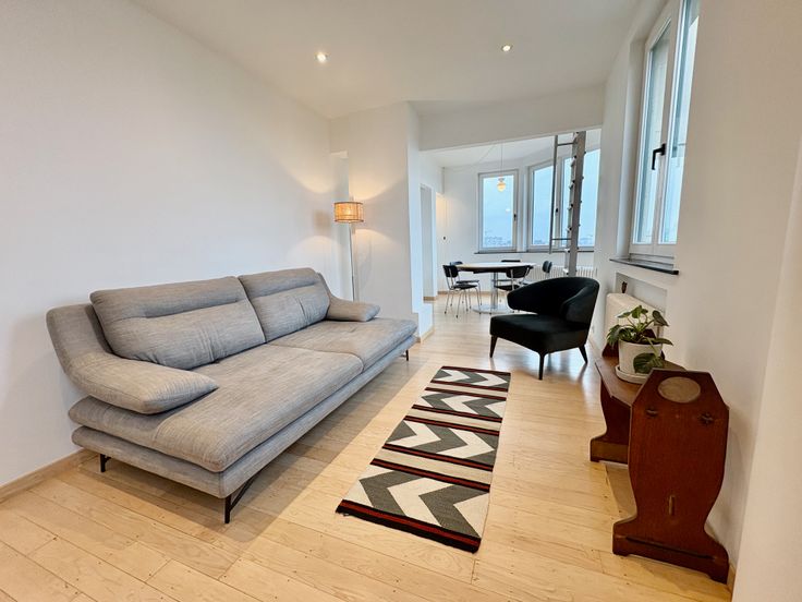Volledig gemeubileerd met hoogwaardige designstukken, waaronder een uitschuifbare eettafel, stoelen, sofa, bed, wasmachine en keukenbenodigdheden.