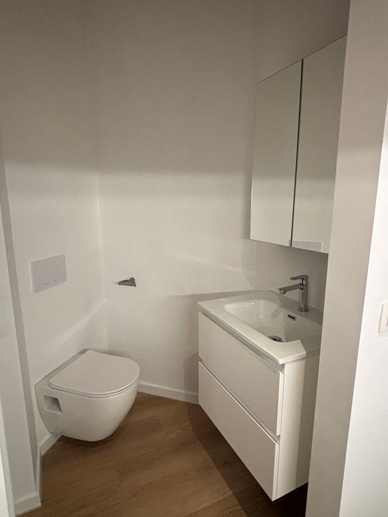 • Badkamer: Hangtoilet, meubel met spiegel.