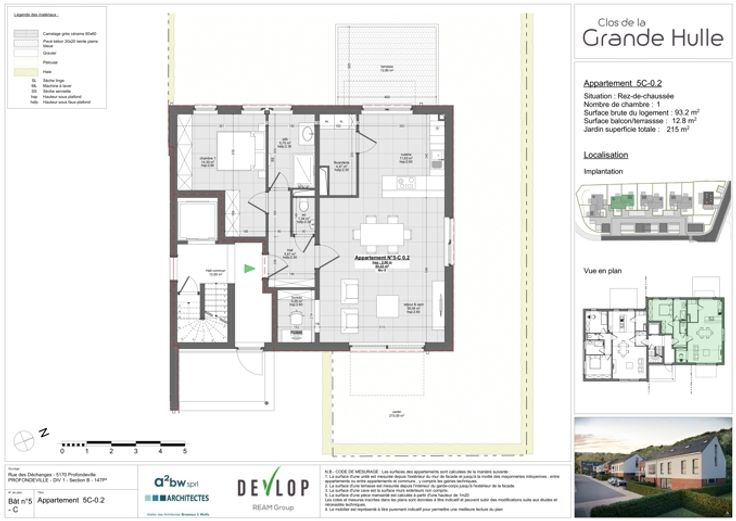 PROFONDEVILLE – Dans un écrin de verdure, bel appartement contemporain (1CH/1SDB) de 93,20 m² situé au rez de la résidence « Clos de la Hulle ». Il se compose d’une buanderie, d’un beau séjour avec cuisine ouverte donnant accès à la terrasse de 12,80 m² et à un jardin privatif, un hall de nuit, une salle d’eau et une chambre. Vue verdoyante et dégagée. L’implantation dans un cadre de verdure permet une architecture ouverte sur le paysage offrant des vues sur un cadre naturel et paisible ; nombreuses possibilités de promenades. L’utilisation de pompes à chaleur géothermiques, de panneaux solaires thermiques et de panneaux photovoltaïques permet de fournir une énergie propre et durable à l’ensemble des résidents. Châssis double vitrage en PVC, excellente isolation acoustique et thermique. Double flux, cuisine équipée, vidéophone. Finitions soignées afin que le confort soit optimal. Parking et local de rangement en sus. PEB prévisionnel « A ». Vente sous régime TVA (21%) pour la construction et sous droits d'enregistrement (12,50%) sur le terrain. La Loi Breyne est d’application. Livraison prévue : septembre 2024. A deux pas des commodités et facilités. Idéal tant pour y habiter que pour y investir ! PRIX FIXES ET NON REVISABLES. A découvrir chez LP au 081/303 404.