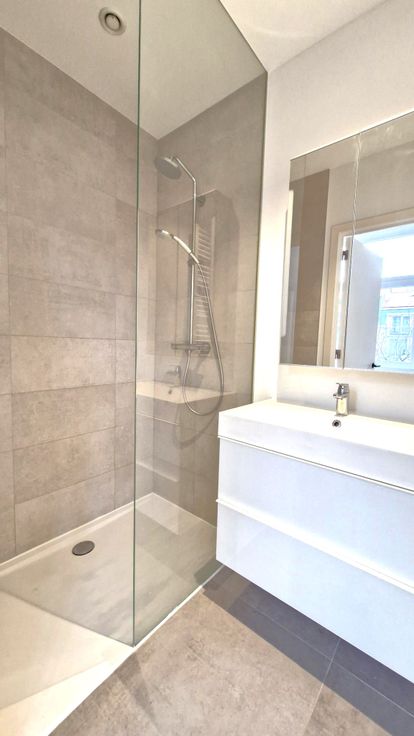 La grande chambre dispose d'un dressing sur mesure et d'une salle de douche intégrée avec meuble évier. Un espace bureau y est également aménagé, idéal pour le télétravail. Une cave privative est incluse, ainsi qu'un espace vélo pour plus de praticité.
