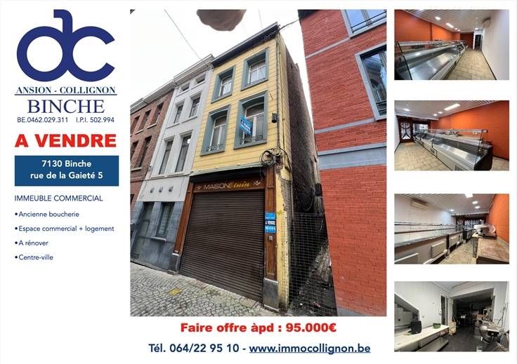 Sorry er is geen nederlandse vertaling beschikbaar. À vendre, Binche, centre-ville, cette surface commerciale idéalement située à un des endroits les plus fréquentés du centre. Cet immeuble anciennement à usage de boucherie pourrait correspondre à de nombreux projets et vous offrira une visibilité accrue. Comprenant au rez : grande surface commerciale, ancienne chambre froide, pièce arrière, wc. Un passage latéral offre un accès séparé et distinct par une ancienne ruelle communale. L'étage de la partie arrière se compose d'une grande pièce. L'étage de l'immeuble principal se compose comme suit, au premier : deux grandes pièces, au second : hall de nuit, deux pièces. Grand grenier aménageable. Le rez-de-chaussée offre une belle visibilité dans une rue à forte fréquentation de passage, à deux pas de la Grand'Place et immédiatement visible de la Grand'Rue. Volet en façade. Le tout sur 1 are 28 ca au sol, soit environ 90 à 100 m2 exploitables au rez. (RC = 1271 EUR). Les étages sont à restaurer mais offrent une belle superficie exploitable de réserve, de stockage ou encore d'un appartement distinct. Belle opportunité à saisir idéalement située pour toute activité commerciale et/ou artisanale. Faire offre à 95.000 EUR. Visites et renseignements au 064/229510.