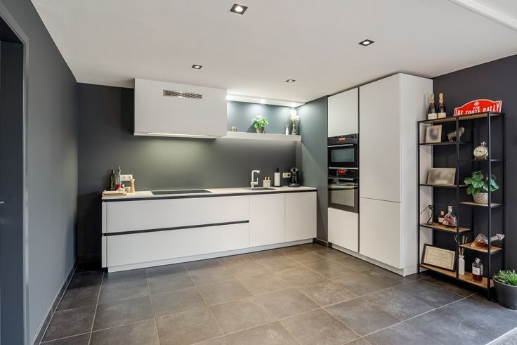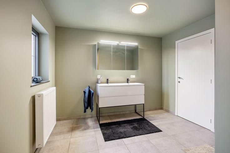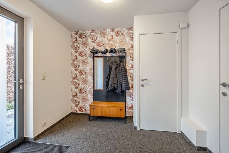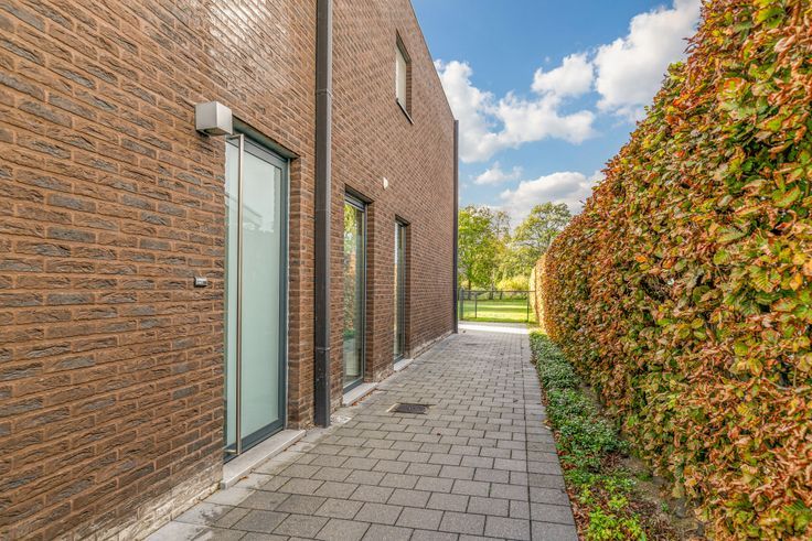 Gelijkvloers vind je een ruime inkomhal met vestiaire, gastentoilet en tellerlokaal. Vandaar betreed je de ruime leefruimte waar de vele raampartijen voor voldoende natuurlijke lichtinval zorgen. De strakke, open keuken werd uitgerust met alle moderne toestellen. Naast de keuken vinden we een ingerichte bijkeuken met wasplaats terug. Hier tref je een tweede koelkast, wastafel en meer dan voldoende kastruimte aan. In deze ruimte vind je ook de toegang naar de kruipkelder.