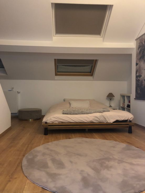Un salon / salle à manger de 30m2, cuisine super équipée avec un bar en pierre et en mansarde une grande chambre avec lit double et salle de bain séparée