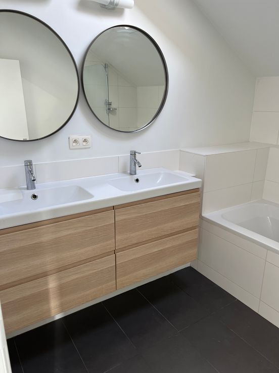 Un escalier en colimaçon mène à un étage que l'on peut diviser en 2 sous espaces (bureau et chambre). Une salle de bain avec double vasque complète cet étage.