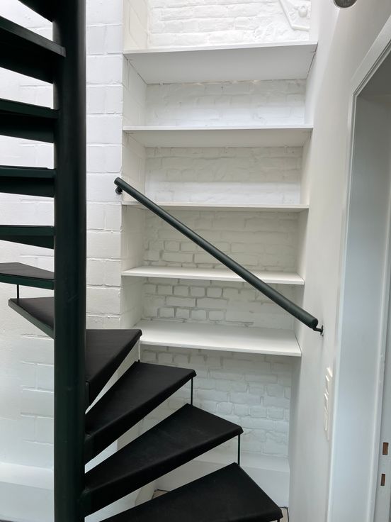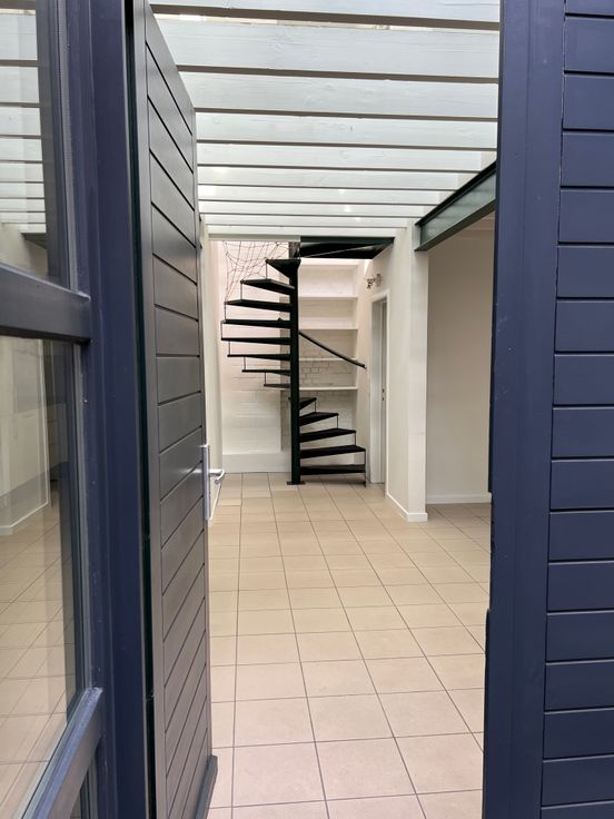 Au fond d'une petite impasse derrière un bâtiment à front de chaussée se situe ce loft composé au rez-de-chaussée d'un grand espace séjour d'un côté et salle-à-manger et cuisine équipée de l'autre. Un WC et un vestiaire/buanderie complètent l'équipement du rez.