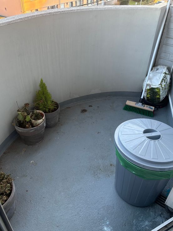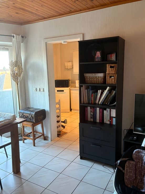 Il se compose de : 1 chambre ; 1 salle de bain ; 1 toilette, une grande pièce de vie contenant le salon et la salle à manger ; une grande cuisine équipée, un débarras pour les machines et les rangements du ménage ; une grande cave ; un balcon abrité d'un toit.