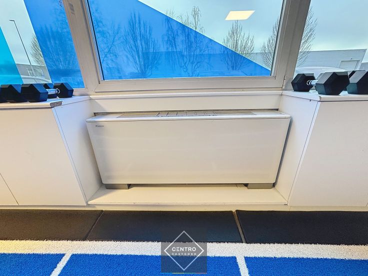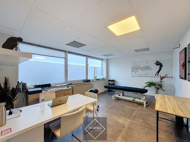 Bevloering in keramische tegels, dubbele beglazing met aluminium schrijnwerk, verlaagd plafond in rockfonpanelen, TL-verlichting.