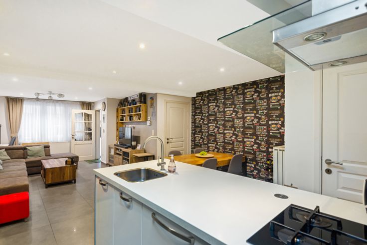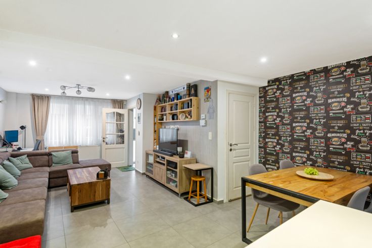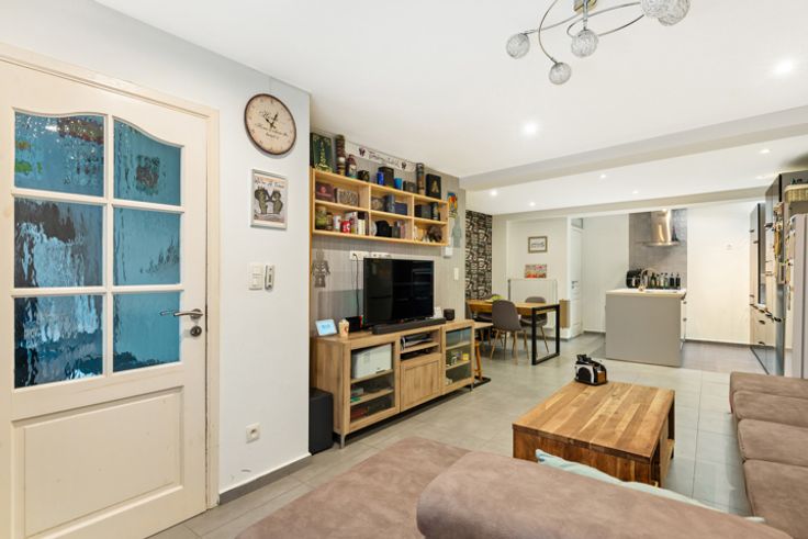 De leefruimte vooraan geeft je de rust om na een lange werkdag te genieten in de sofa. De open keuken is volledig uitgerust en ideaal voor wie graag kookt en samenkomt met familie en vrienden. Op het gelijkvloers is tevens een apart toilet voorzien.