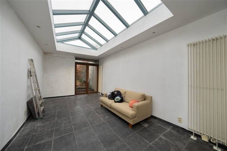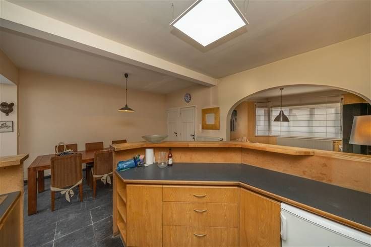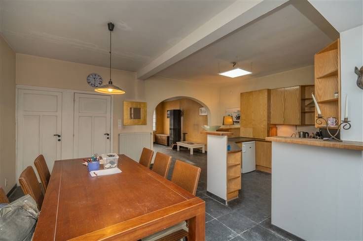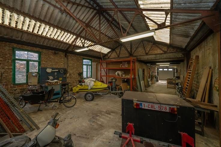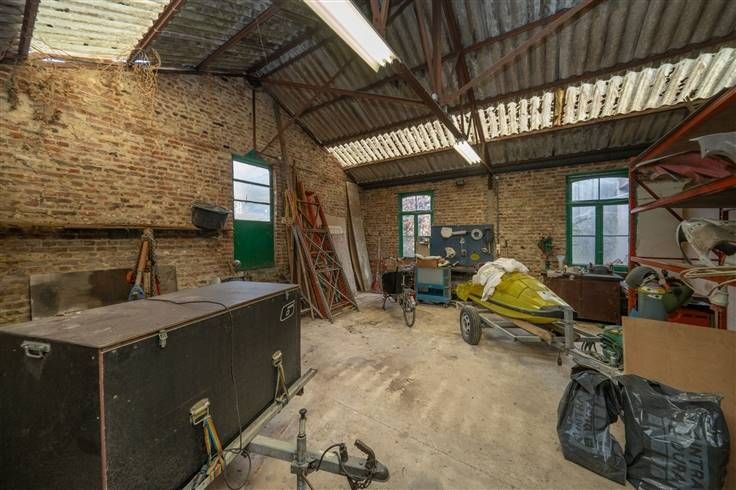 ingerichte keuken en open eetruimte (6m00x4m25), veranda/zitruimte (3m40x5m85) uitgevend op de tuin, sas met WC (2m60x2m40), garage (15m40x3m30), werkruimte (7m60x7m80), berging (4m30x3m30), tuin