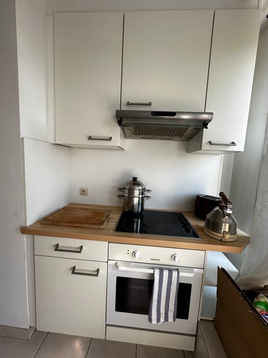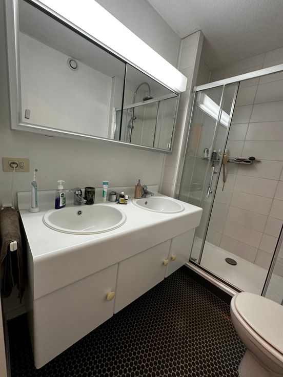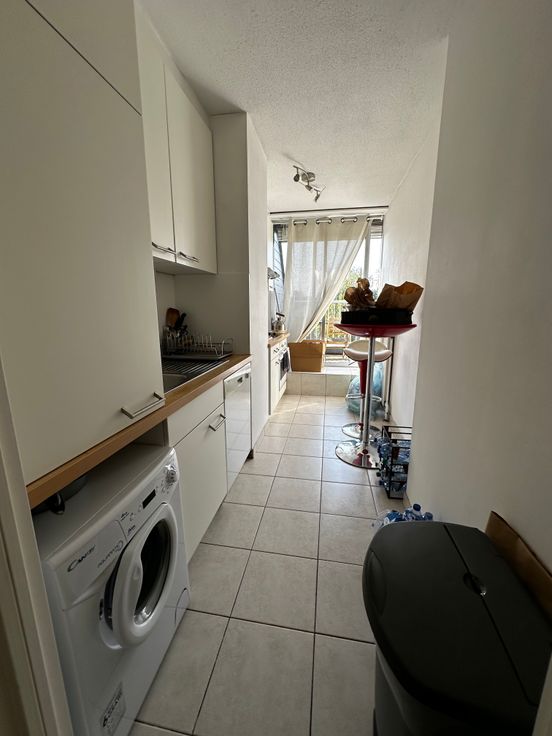 L’appartement dispose d’une chambre à coucher, un hall de nuit, une salle de douche avec deux éviers, une toilette et une grande douche. Un hall d’entrée avec vestiaire amène dans le séjour ouvert avec baie vitrée qui donne accès à la grande terrasse de 10m2 équipée d’une tente solaire. Un grenier de rangement (6m2) se trouve également dans le séjour. La cuisine est hyper équipée avec frigo intégré, 4 taques de cuisson vitrocéramique, hotte, four, évier, lave-vaisselle et machine à laver le linge.