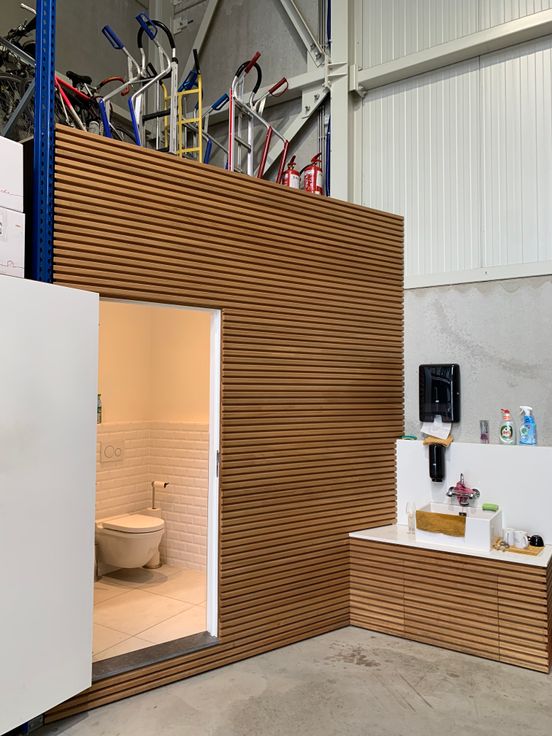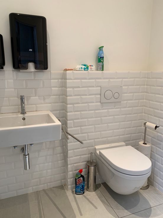 Kwalitatieve sanitaire unit met toilet, urinoir en Duravit wastafel met warm en koud water. Daarbuiten een wasbak met warm en koud water.