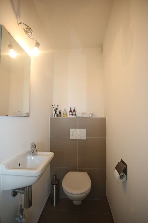 gelijkvloers: knappe inkomhal met gastentoilet, open keuken (voorzien van alle toestellen), lichtrijke leefruimte bestaande uit zit - en eethoek, berging en een schitterend ruim (zuid-gericht) terras.