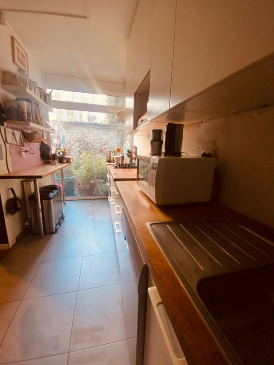 Je komt de woning binnen via de inkomhal op authentieke cementtegel. Verder bevindt er zich de ruime woonkamer en halfopen keuken met gasfornuis, oven, ijskast en afwasmachine. Via de grote ramen kom je op een gezellig terras.