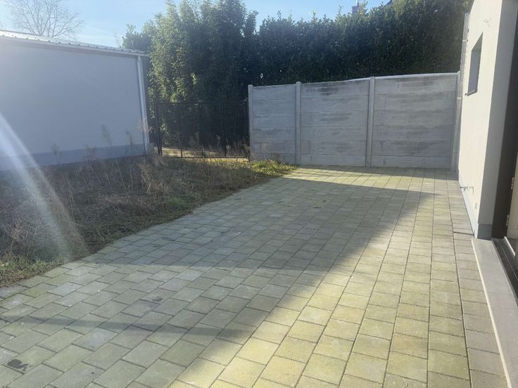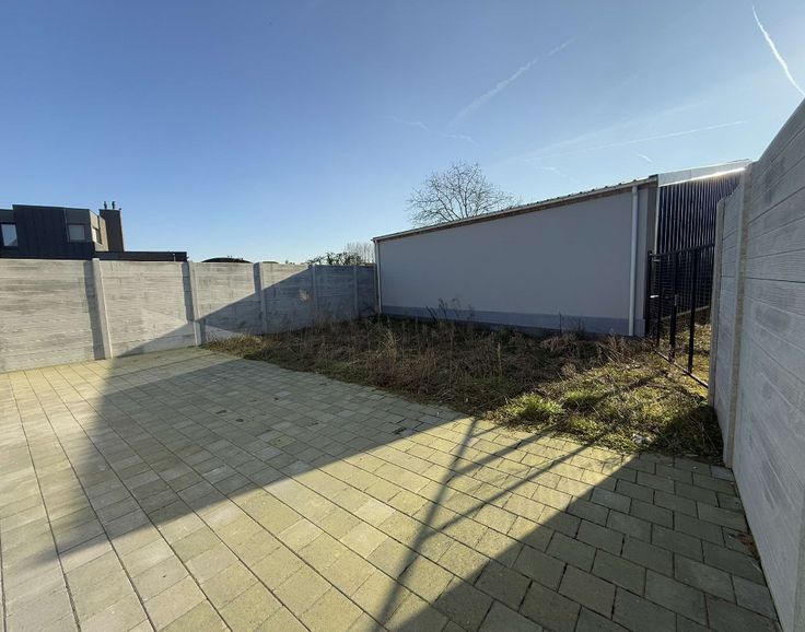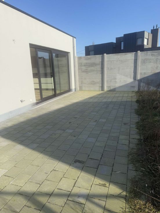 Terras met tuin (wordt nog aangelegd). Poortje in tuin. 1 autostaanplaats.