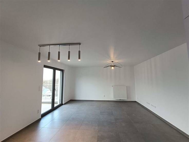 Hall d'entrée, 1 chambre (11m²), bureau, wc séparé, buanderie, salle de douche avec wc, cuisine équipée ouverte sur le living, balcon, cave, parking et local vélo.