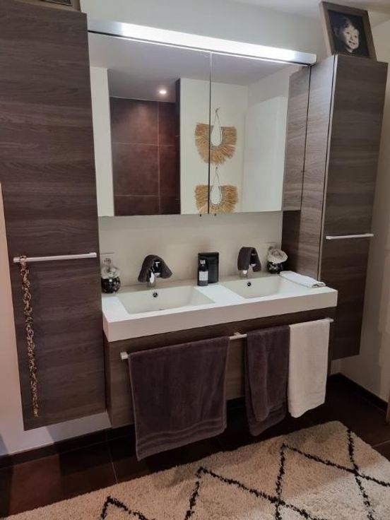 Op de eerste verdieping hebben we "master-bedroom" met dressing, 2 slaapkamers, badkamer met dubbele lavabo - ligbad - douche, aparte toilet.